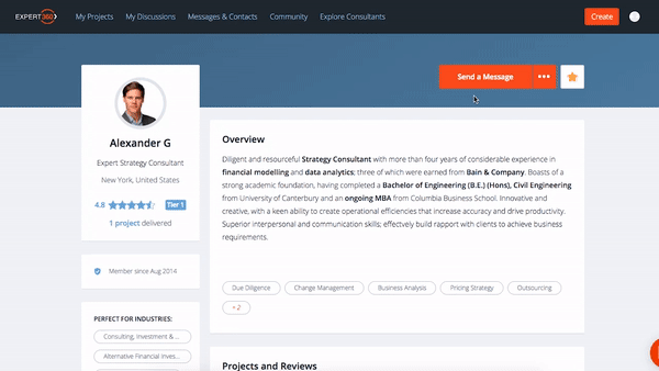 Once you've posted your project on Expert360, it's time for you to get matched with and hire one of our elite consultants. While you will automatically be matched with world-class talent, it's important that you spend some time exploring your options if you have specific or niche needs.